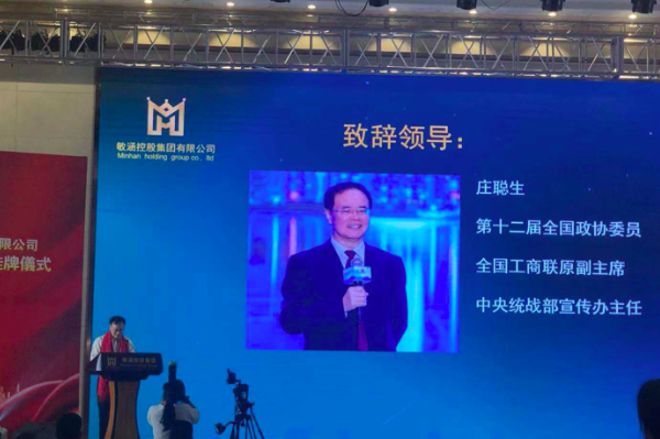 全国工商联原副主席、全国政协参政议政人才库特聘专家庄聪生应邀参加挂牌仪式,对敏涵控股集团有限公司成功挂牌表示祝贺,希望敏涵公司可以尽快成为让国家骄傲,成为让国人自豪的世界一流民族品牌。